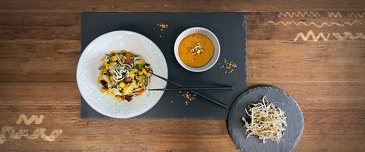 Für etwas Extra-Crunch und noch mehr Erdnuss-Geschmack etwas Erdnussmus crunchy unter die Sauce rühren und mit ein paar Erdnusskernen garnieren. Wer es gerne scharf mag, kann noch mit Chiliflocken oder frischem Chili würzen.