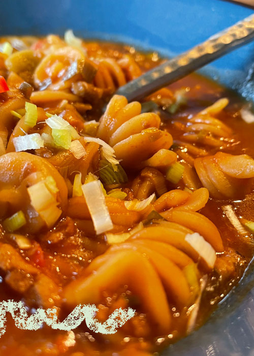 Ich liebe Eintöpfe und sie gehören fest in mein Essensrepertoire. Eines der ersten Rezepte die ich in der siebten oder achten Klasse in der Schule im Hauswirtschaftsunterricht gelernt habe, begleitet mich und meine Familie bis heute und es wird sich regelmäßig gewünscht. Dabei ist es so simpel und besteht im Grundrezept aus eigentlich nur vier Grundzutaten: Spirelli-Nudeln, Porree, Tomatenmark und Hackfleisch. So ist die Variante auf jeden Fall auch kindertauglich. Bei mir gibt es mittlerweile aber auch oft die gepimpte Version mit etwas mehr Schärfe und da ich schon lange vegetarisch lebe, ersetze ich das Hackleisch durch eine pflanzliche Variante.