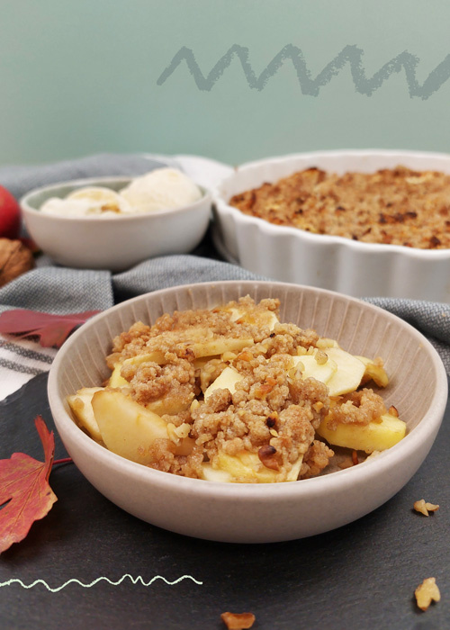 Aus der veganen Butter, Zucker, Zimt und Mehl mit dem Mixer oder einer Küchenmaschine eine Streuselmasse herstellen. Diese über die Äpfel streuen und anschließend bei 180° ca. 20-25 Minuten goldbraun backen.