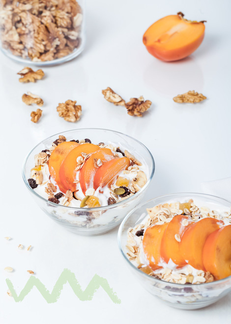 Fruchtiger Joghurt-Snack: Mische Naturjoghurt mit einer Handvoll Beeren, gehackten Nüssen und einem Schuss Honig für eine süße und gesunde Zwischenmahlzeit.