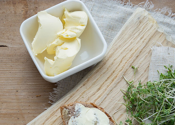 Die Margarine – sie ist auch gekühlt streichfähig. Dies liegt an den ungesättigten Fettsäuren und dem dazugehörigen höheren Schmelzpunkt. Beim Backen verträgt die Margarine die Hitze besser als Butter (Gesättigte Fettsäuren in der Butter haben einen sehr niedrigen Rauchpunkt).