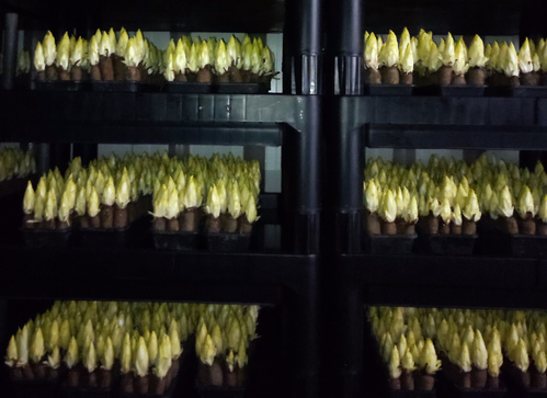 Bevor der Chicorée auch trotz Dunkelheit die Blüte bilden würde, wird der Chicorée geerntet. Dabei ist dieser circa 15 Minuten am Licht und wird dann schnell wieder in Papier eingewickelt und in Kisten verpackt, damit er möglichst lange schmackhaft bleibt und nicht bitter wird.