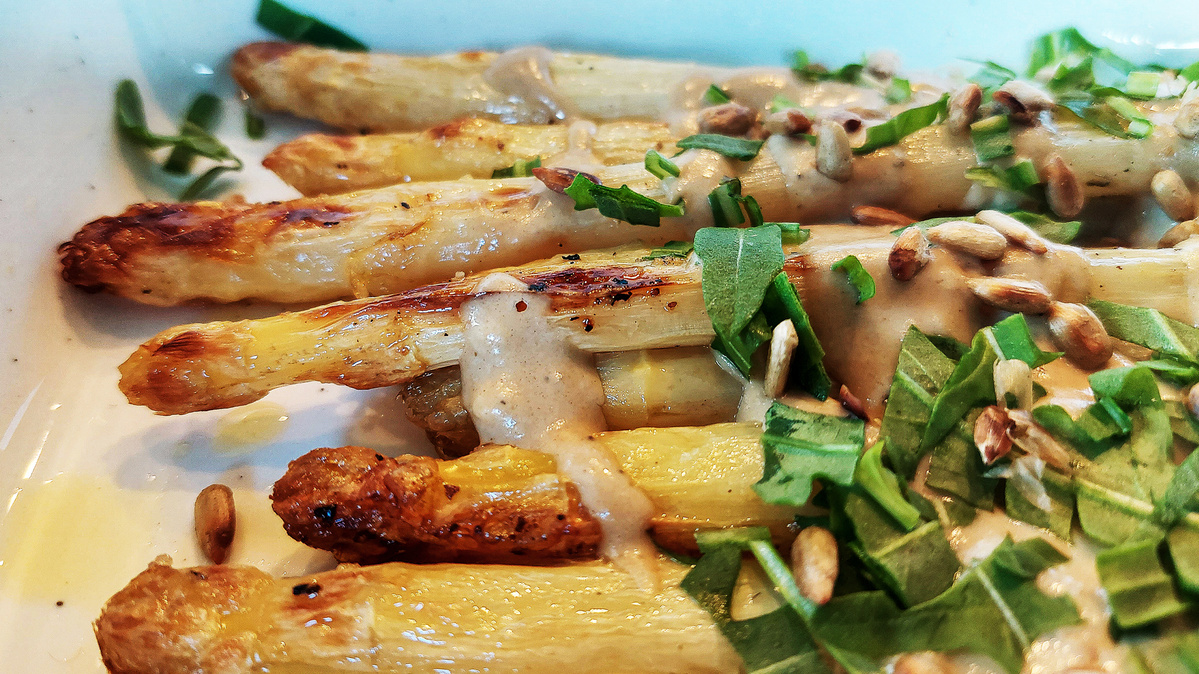 4. Nun den gerösteten Spargel auf einer Platte anrichten und die Tahin-Zitronen-Soße darüber verteilen. Anschließend den gehackten Rucola und die gerösteten Sonnenblumenkerne darüber verteilen.
