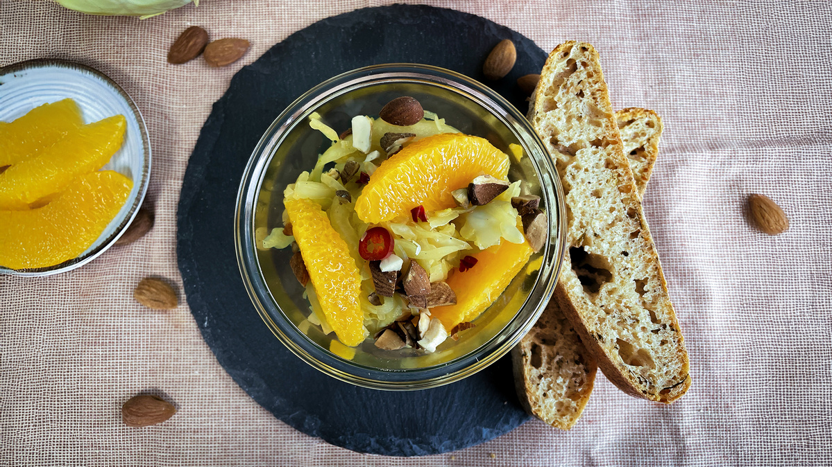 6. Kohl ausdrücken, mit der Marinade vermischen und abschmecken. Vor dem Servieren mit den gerösteten Kernen bestreuen und mit Orangenfilets garnieren.