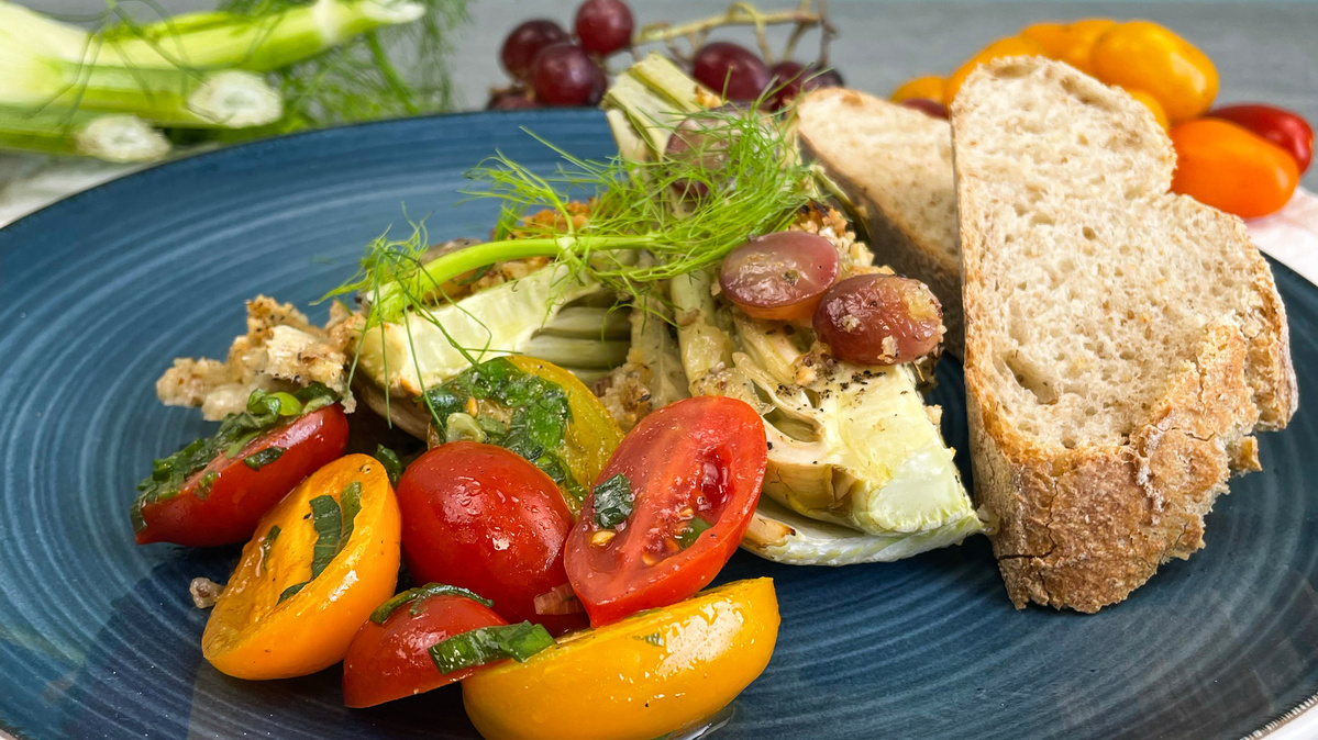 6. Gratinierter Fenchel zusammen mit den Weintrauben auf Teller anrichten und servieren.