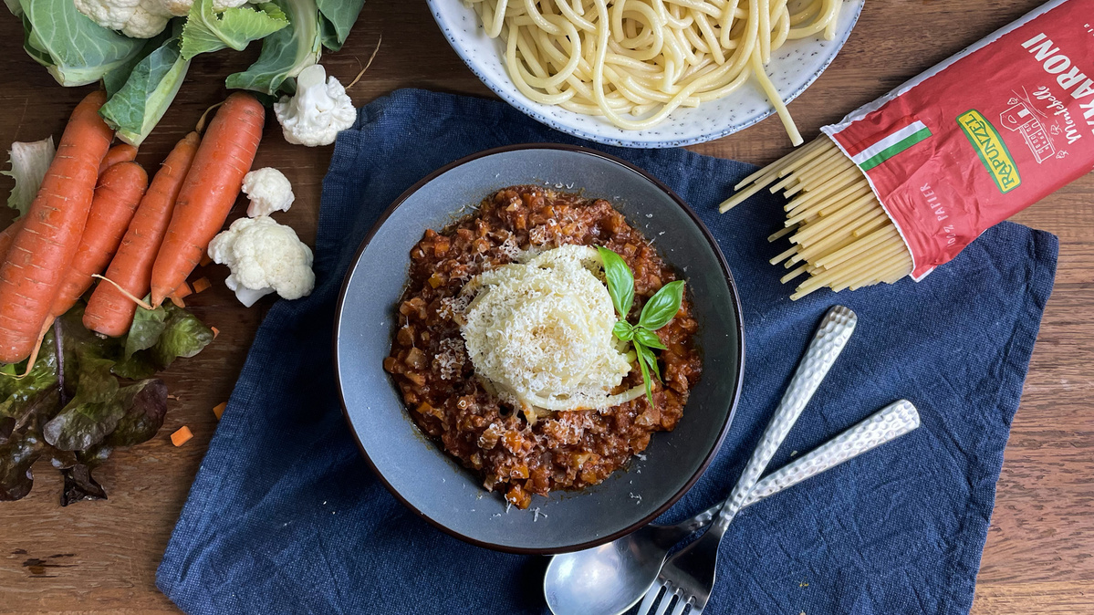 5. Die Sauce abschmecken mit Dattelsirup, Salz, Pfeffer und mit dem Basilikum garnieren. Nudeln abgießen und zusammen mit der Bolognese servieren. Nach Belieben mit Parmesan oder einer veganen Alternative bestreuen.