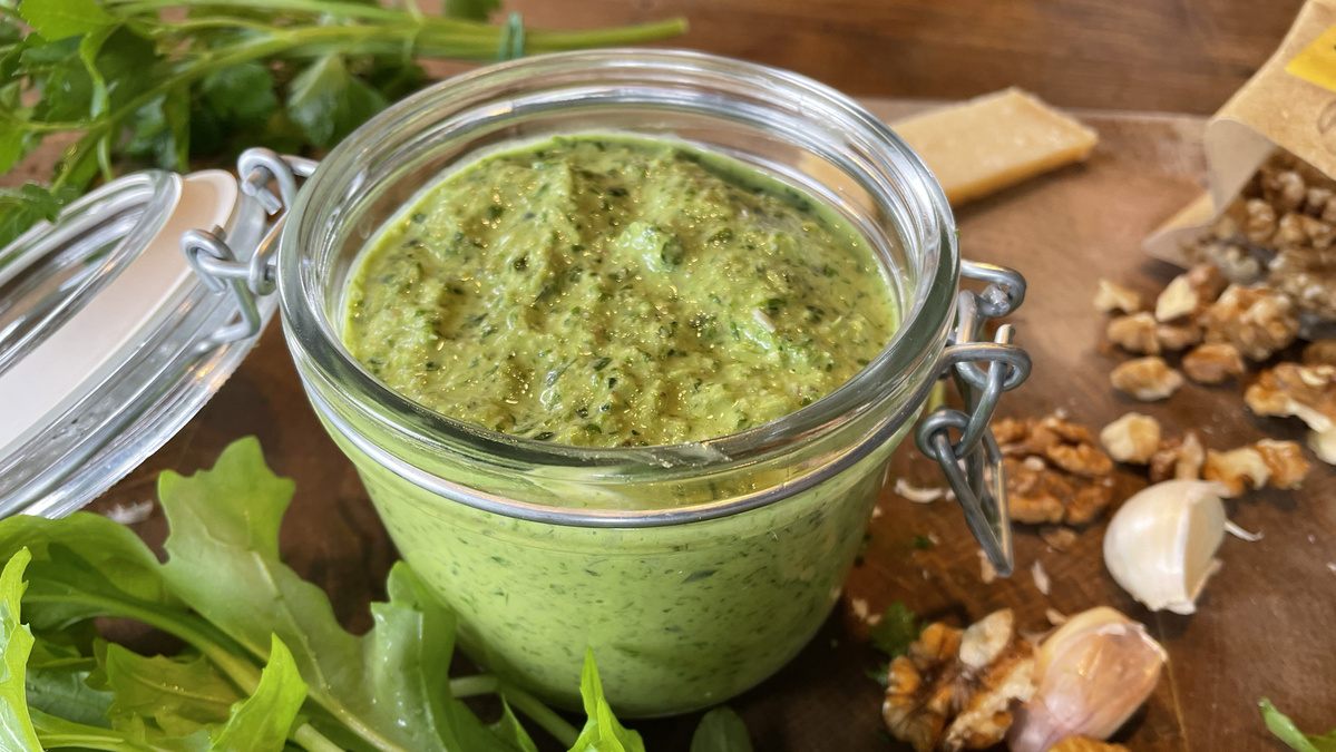 3. Stielmus, Walnüsse, Knoblauch, Petersilie und Parmesan in einen Mixbecher geben, pürieren und dabei langsam 80 ml Olivenöl hineinlaufen lassen.