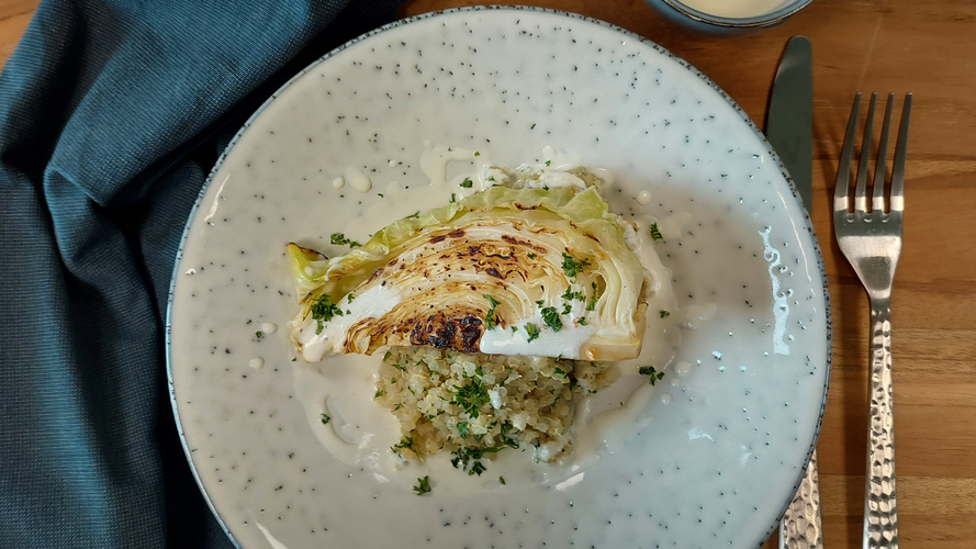 Spitzkohlspalten mit Quinoa und cremiger Fetasoße – leicht karamellisiert, mild-würzig und schön ausgewogen. Ein feines Gemüsegericht mit Biss.