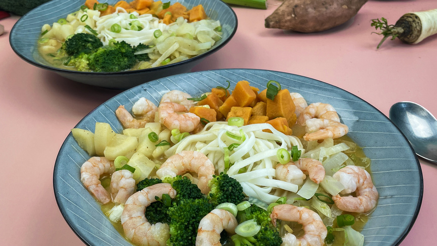 339. Curry-Nudelsuppe mit Süßkartoffeln, Brokkoli und Garnelen